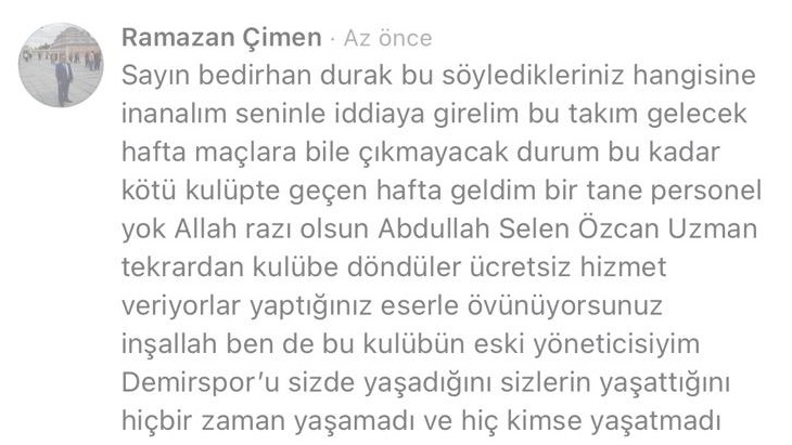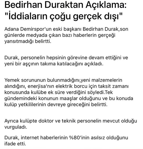 Adana Demirspor eski yönetim kurulu üyesi Yönetici Ramazan Çimen Adana Demirspor eski Başkanı Bedirhan Durak’ın medyada çıkan haberlerin gerçeği yansıtmadığını belirtmesine tepki gösterdi.