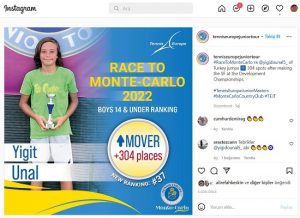 Geliştirme Şampiyonası’nda Bosna-Hersek, Gürcistan, Kosovalı rakiplerini yenerek teklerde yarı final, çiftlerde ise final oynayarak büyük başarı elde eden Adanalı raket, Uluslararası Tenis Federasyonu’nun en büyük bölgesel birliği olan, 50 Avrupa üye ülkesinin tenisçilerinin bağlı olduğu TennisEurope’ta 304 basamak yükselerek, kendi yaş grubunda 37 numara oldu. Ünal’ın bu başarısı TennisEurope’un resmi web sayfasında ve instagram sayfasından da duyurularak, kutlandı. TennisEurope’te Ünal’ın 37’nci sıraya kadar yükseldiği 14 yaş erkekler grubunda 1197 tenisçi bulunuyor.