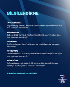 Süper Lig’de deplasmanda İstanbulspor’la karşılaşacak Adana Demirspor’da Jose Rodriguez, Emre Akbaba, Yusuf Sarı, Youcef Atal ve Semih Güler sakatlıkları nedeniyle maç kadrosuna alınmadı.
