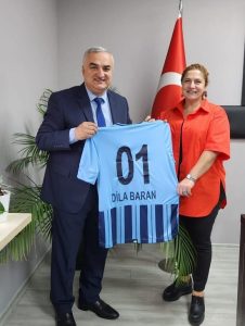Dila hanımı makamında ziyaret eden KGK Projeler Kurulu Başkanı gazeteci yazar Ahmet Külekçi, kendisine aynı zamanda Adana Demirspor forması hediye etti.