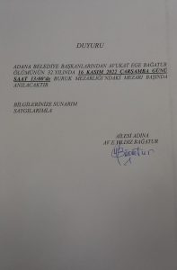 Adana Belediyesi eski başkanlarından Av. Ege Bagatur, ölümünün 32. Yıldönümünde Buruk Mezarlığında Mezarı Başında Saat 13.00 da anılacak.