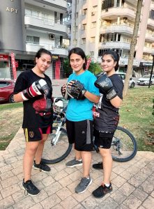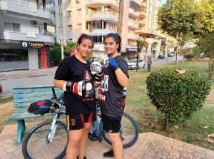 Genç Kick Boksçu Ada Çetinel’e bir genç sporcu da eşlik ediyor. İki sporcu hem antrenör Elif Sarı Güney hem de karşılıklı maç yaparak hazırlanıyorlar.