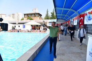Başkan Soner Çetin, yüzme kurslarına gösterilen ilgiden çok memnun olduğunu belirterek, “Buraya gelen çocuklarımız bütün olumsuz enerjilerini atacaklar, daha mutlu çocuklar olacaklar. Çocuklarımız burada yüzme öğrenecek baraja, kanallara girmeyecek. Çocuklarımızdan bunun sözünü istiyorum. Sporla uğraşan çocuklar derslerinde daha başarılı olurlar. Siz de spora devam edin, sakın bırakmayın. Biz de sizler için çalışacağız. Gazi Mustafa Kemal Atatürk’ün çizdiği yoldan ayrılmayın. Cumhuriyetin temel değerlerine sahip çıkan bireyler olun. Atatürk cumhuriyeti sizlere emanet etti, siz de bu emanete sahip çıkacaksınız” şeklinde konuştu.
