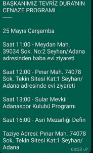 Merhum Dura’nın Cenaze programı