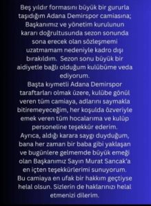 İzzet Çelik paylaşımında, “Beş yıldır formasını büyük bir gururla taşıdığım Adana Demirspor camiasına veda ediyorum. Sözleşmemin uzatılmaması nedeniyle kadro dışı bırakıldım. Büyük bir aidiyetle bağlı olduğum kulübüme sezon sonunda veda edeceğim” ifadelerini kullandı.