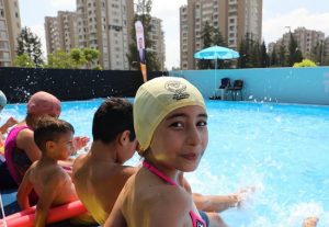 Atakent Mahallesi 15 Temmuz Şehitler Parkı yanında kurulan portatif havuzda 6-14 yaş aralığındaki çocuklar hem eğlenceli vakit geçiriyor hem de uzman eğitmenlerden yüzme dersi alıyor. 1670 çocuğun kayıt yaptırdığı yüzme kursları hafta içi 10.00 – 15.00 saatleri arasında 40’ar dakikalık seanslar halinde devam ediyor.